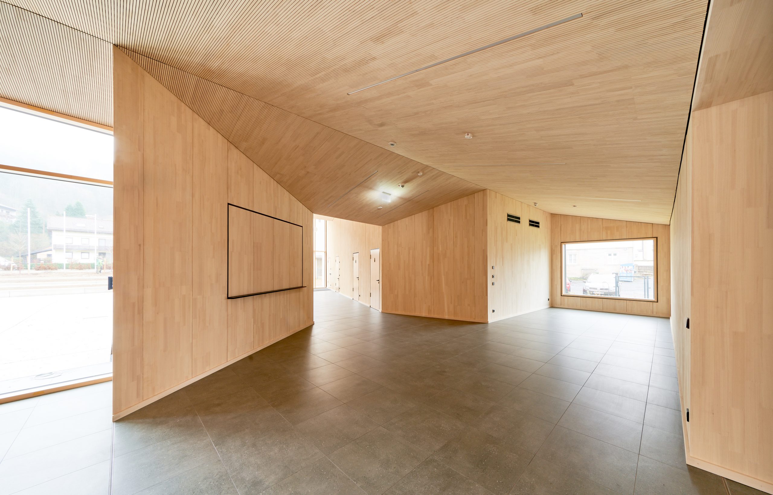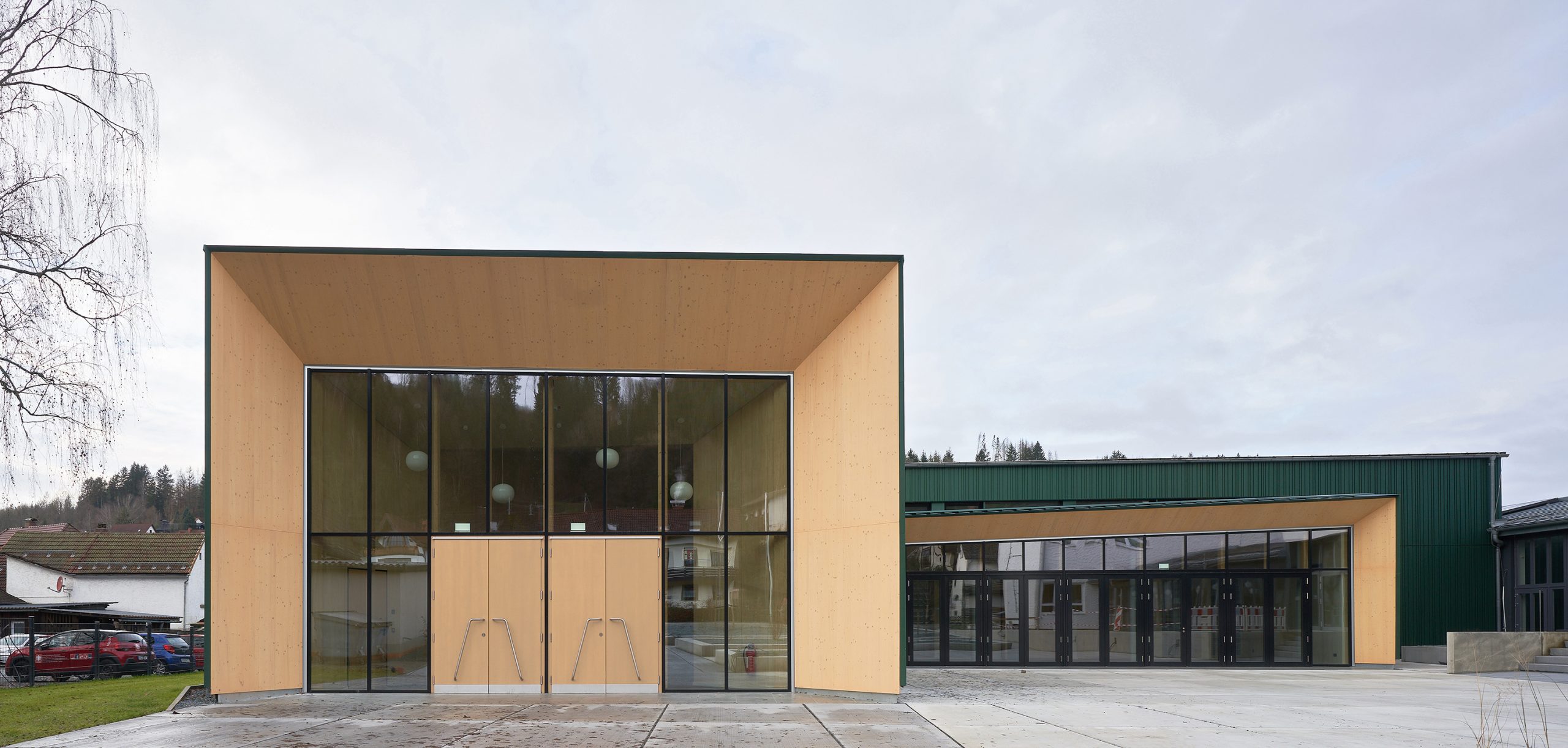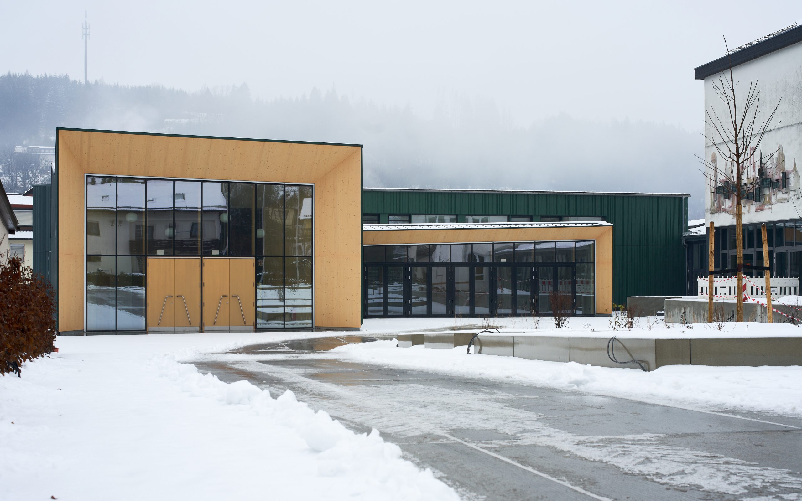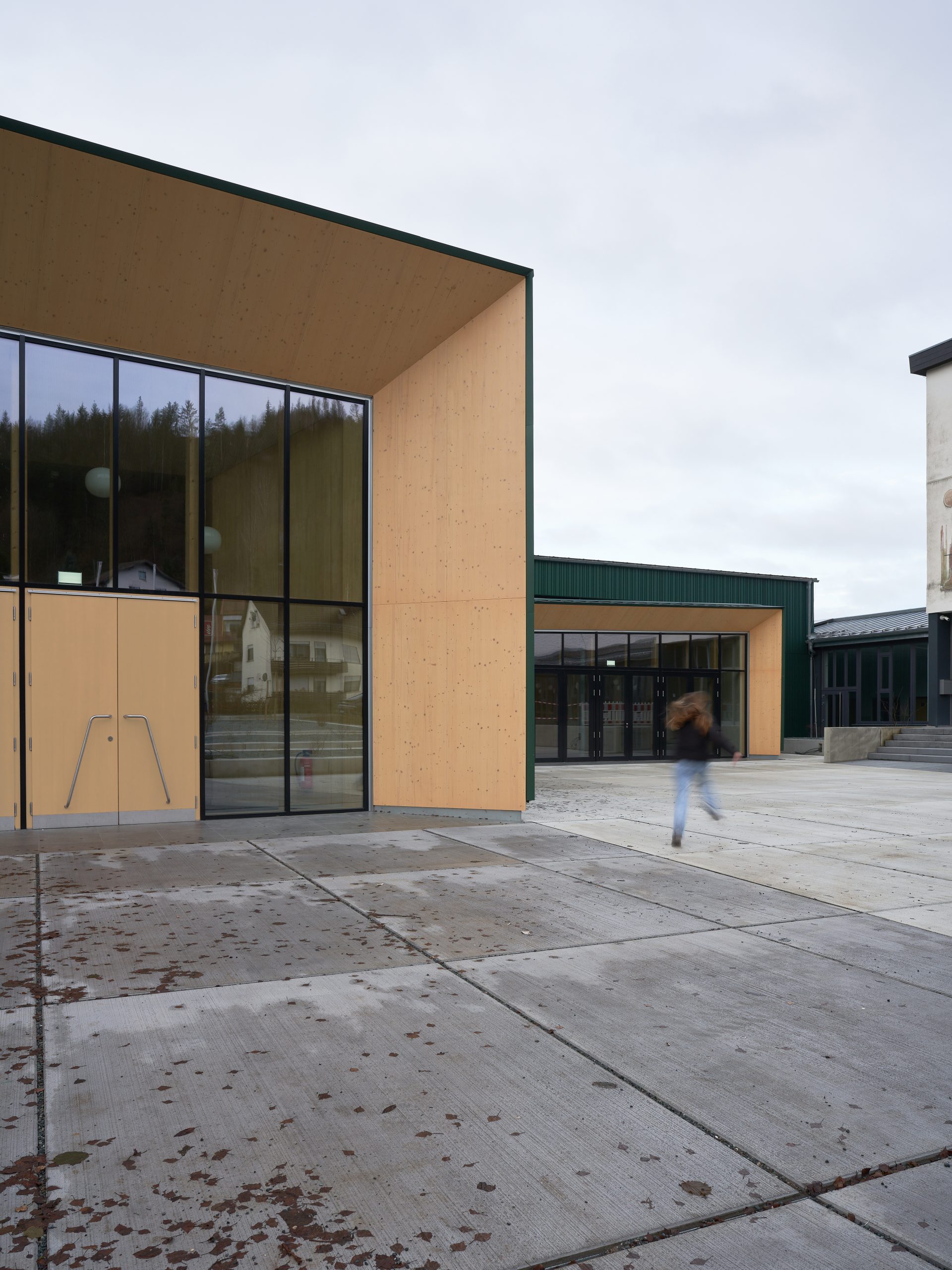 Der neue Eingangspavillon der Kulturhalle fasst den Vorplatz nach Südwesten. Das neue Foyer bildet gleichzeitig Fuge und Verbindung zwischen dem Pavillon und der Halle. Das Vorfeld der Halle ist geprägt vom Aufeinandertreffen der kleinteiligen Strukturen des Ortskerns und der Baumasse des Schulkomplexes. Hier vermittelt der Neubau durch seine Form und setzt einen Akzent durch seine Höhe. Die fein gefaltete Dachlandschaft mit Giebeln zum Zentrum bricht den Maßstab der Veranstaltungshalle auf den der benachbarten Wohnhäuser. Durch überlegt gesetzte Ausblicke verbindet sich die Halle mit dem Ort: die Kirche Mariä Geburt ist vom Foyer zu sehen, die bewaldeten Hänge über die neu geöffneten Fenster in der Halle und im Foyer. Eben diese Öffnungen sind es auch, die der Kulturhalle die neue Orientierung zum Kulturplatz hin geben.