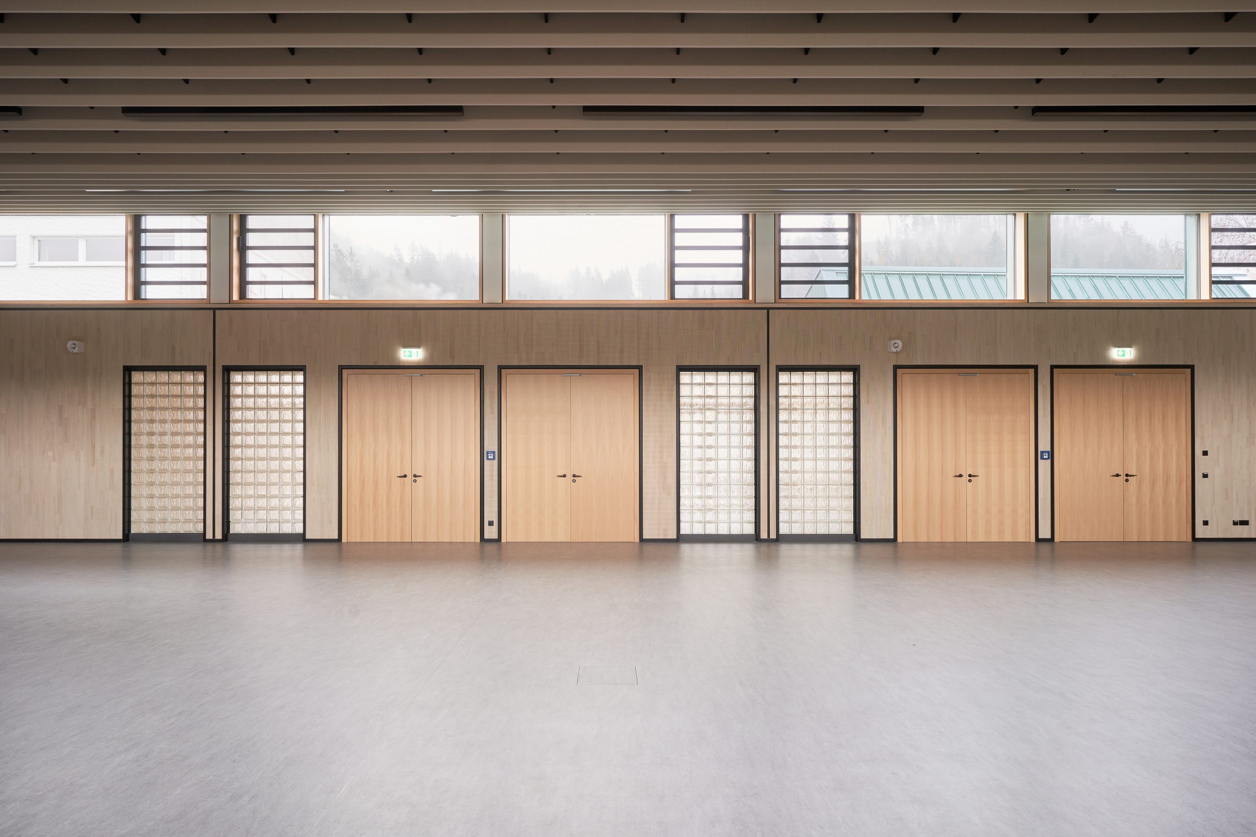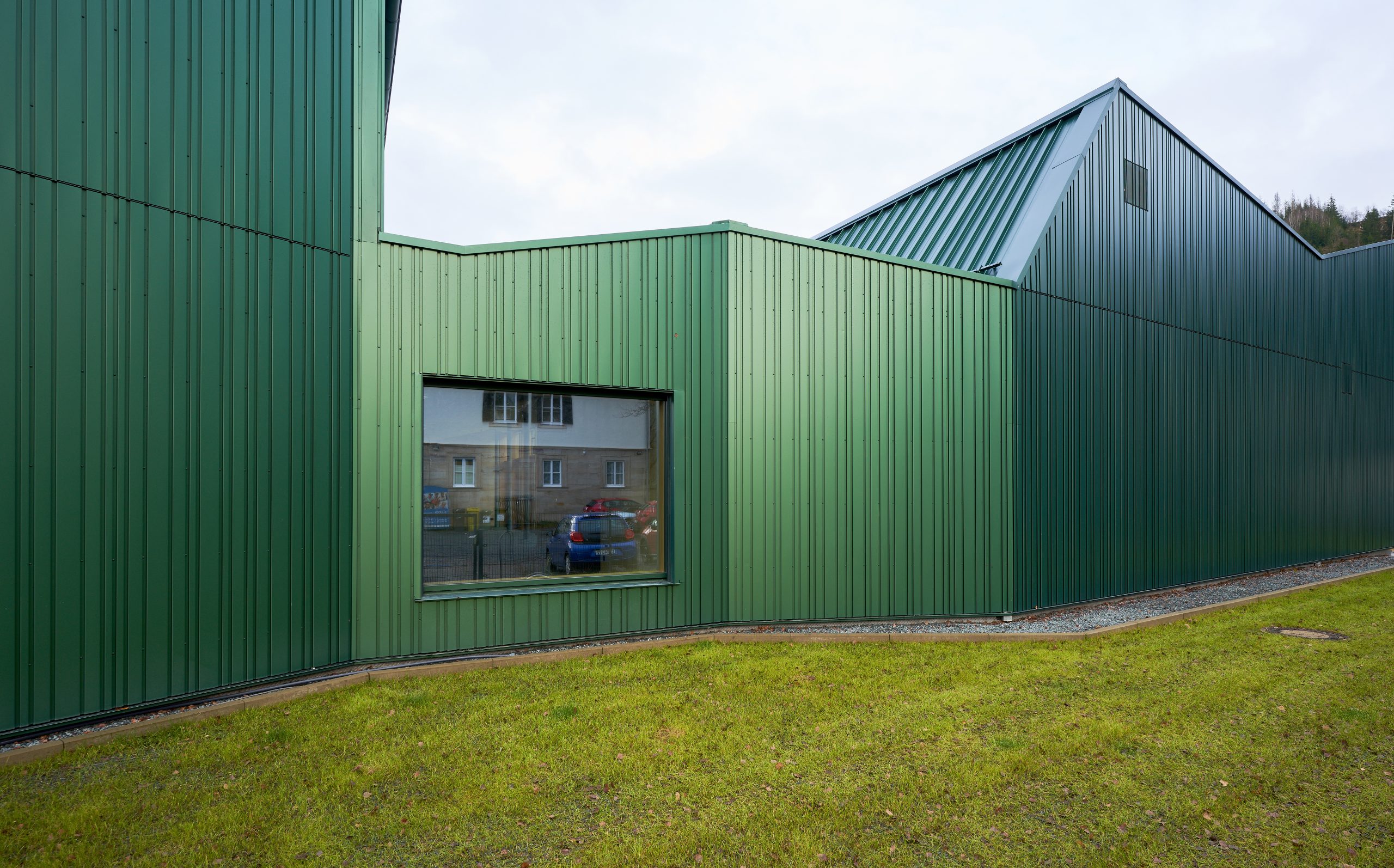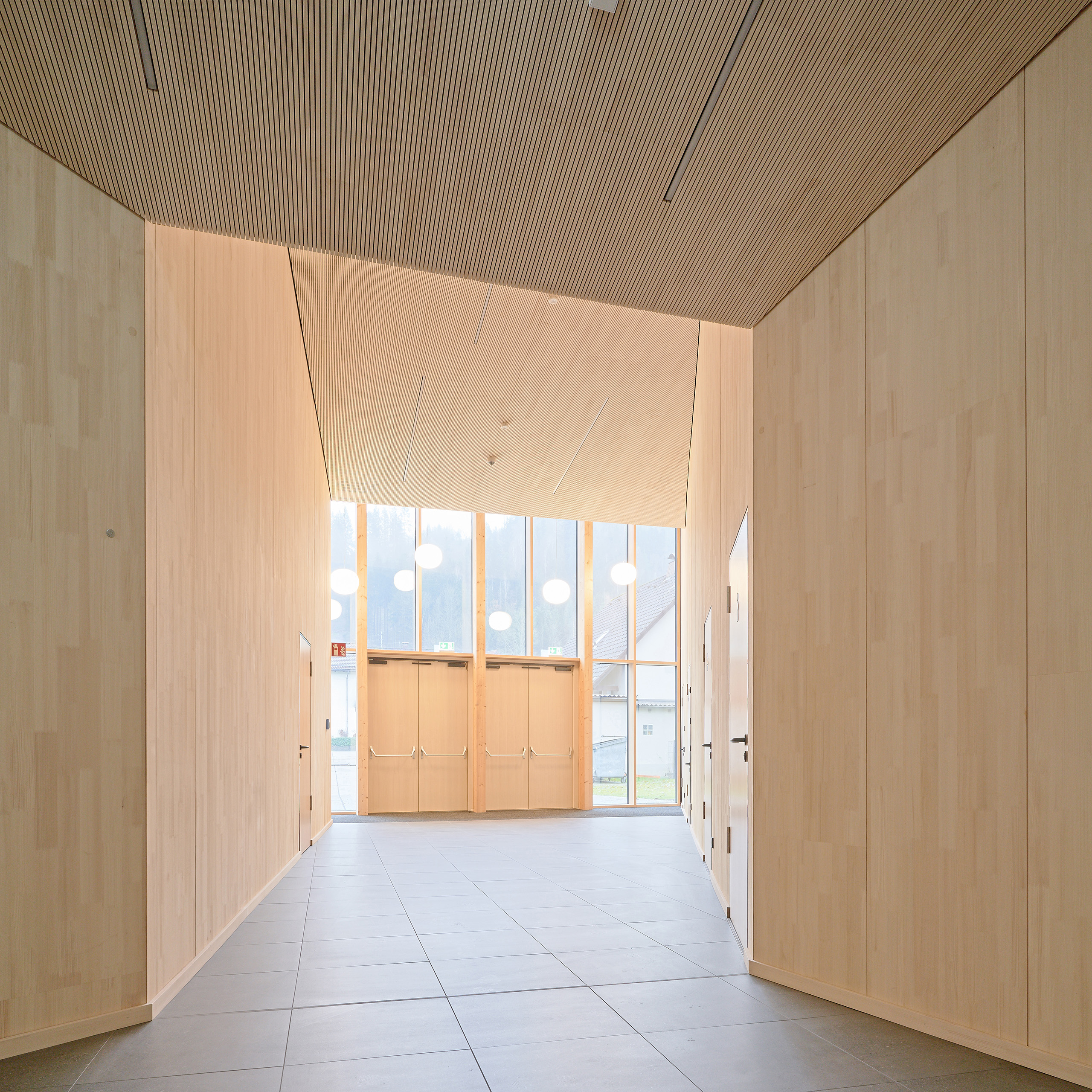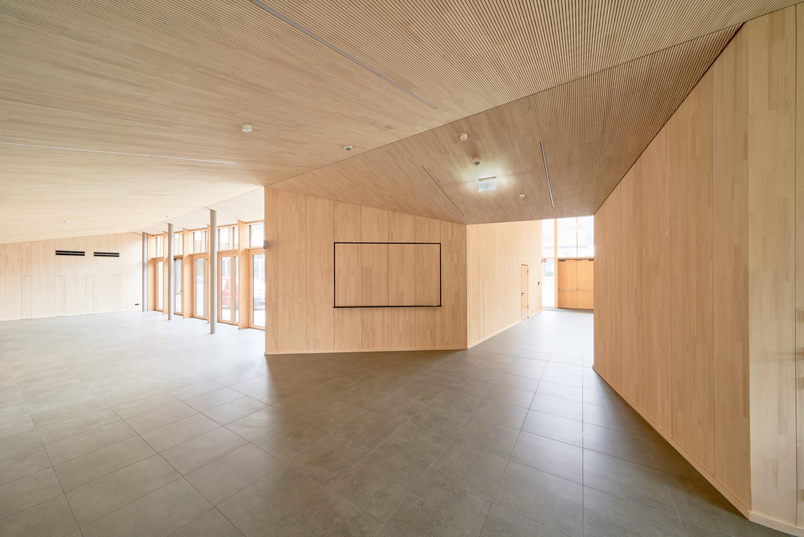 Der neue Eingangspavillon der Kulturhalle fasst den Vorplatz nach Südwesten. Das neue Foyer bildet gleichzeitig Fuge und Verbindung zwischen dem Pavillon und der Halle. Das Vorfeld der Halle ist geprägt vom Aufeinandertreffen der kleinteiligen Strukturen des Ortskerns und der Baumasse des Schulkomplexes. Hier vermittelt der Neubau durch seine Form und setzt einen Akzent durch seine Höhe. Die fein gefaltete Dachlandschaft mit Giebeln zum Zentrum bricht den Maßstab der Veranstaltungshalle auf den der benachbarten Wohnhäuser. Durch überlegt gesetzte Ausblicke verbindet sich die Halle mit dem Ort: die Kirche Mariä Geburt ist vom Foyer zu sehen, die bewaldeten Hänge über die neu geöffneten Fenster in der Halle und im Foyer. Eben diese Öffnungen sind es auch, die der Kulturhalle die neue Orientierung zum Kulturplatz hin geben.