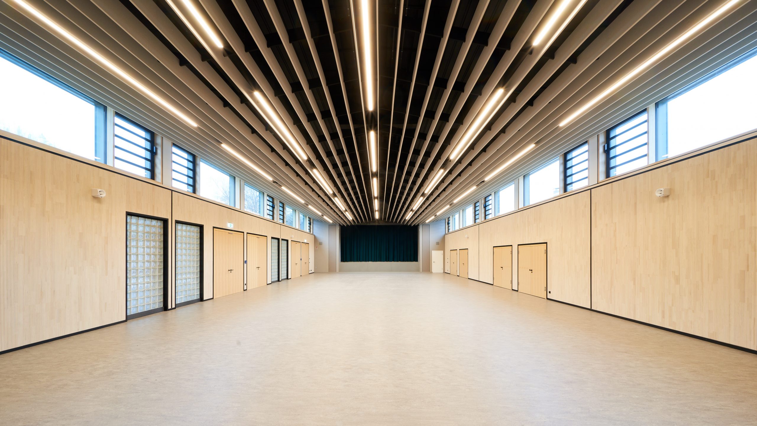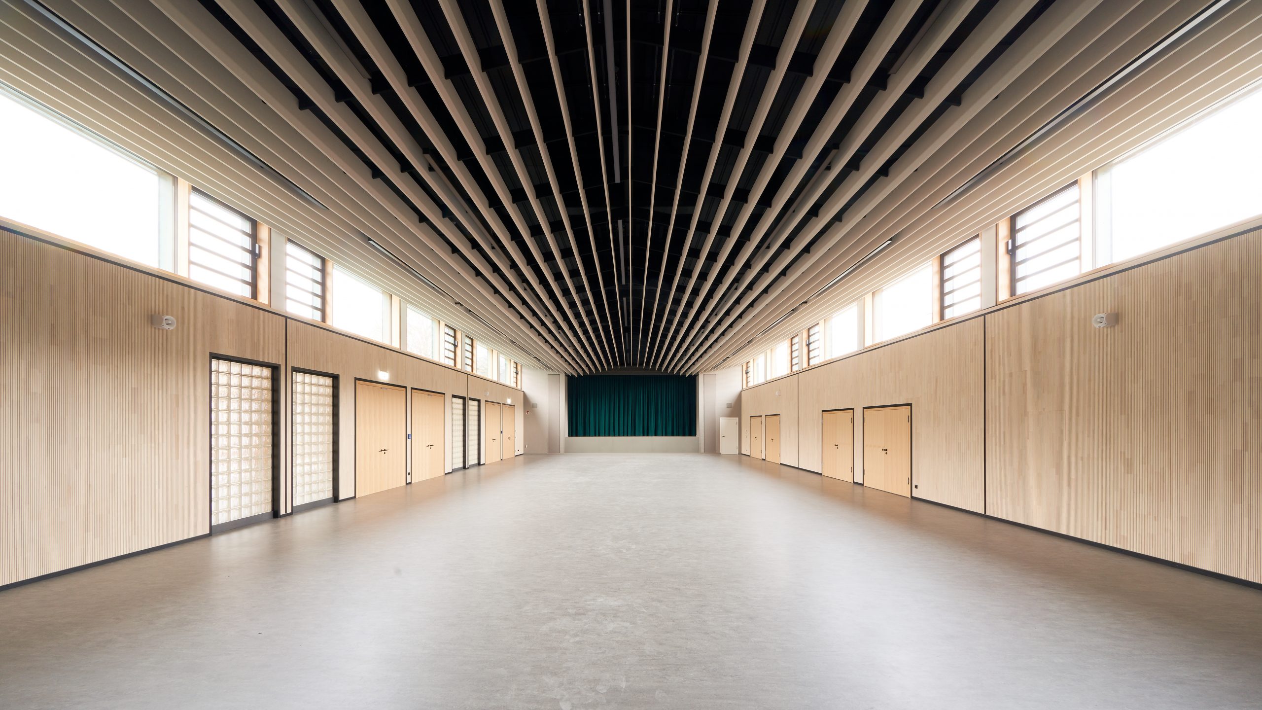 Steinwiesen erhält eine neue Veranstaltungslandschaft, eine Kulturhalle, einen Treffpunkt für die Gemeinde, einen Versorgungspavillon für Feste auf dem neuen Kulturplatz – je nach Art und Größe der Veranstaltung. Die Möglichkeiten der Nutzung sind vielfältig, die neue Infrastruktur schaltbar, nutzungsneutral und offen für viele Interpretationen. Funktional und optisch aus dem Schulkontext herausgelöst, präsentiert sich die neue Kulturhalle selbstbewusst im Ortskern ohne aufdringlich zu sein und nimmt in ihrer baulichen Sprache die Rolle des Vermittlers zwischen Einfamilienhäusern und dem Schulkomplex ein.